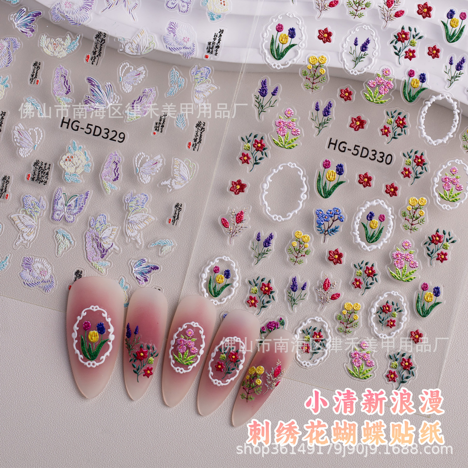 5D 新しいロマンチックな刺繍花蝶ネイルアートステッカー小さな新鮮な立体レリーフ牧歌的な花フレーム粘着裏地付き