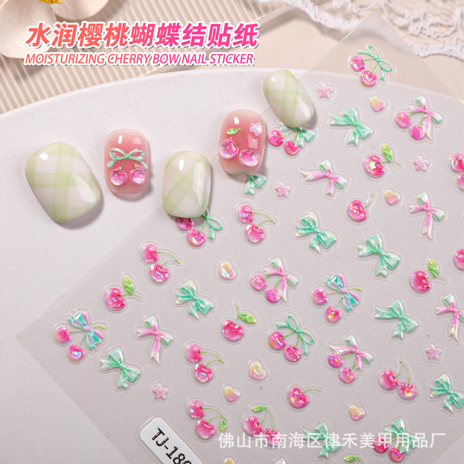 夏の人気のインシェルライトチェリーリボンネイルアートステッカー立体レリーフ保湿チェリーネイルデカール