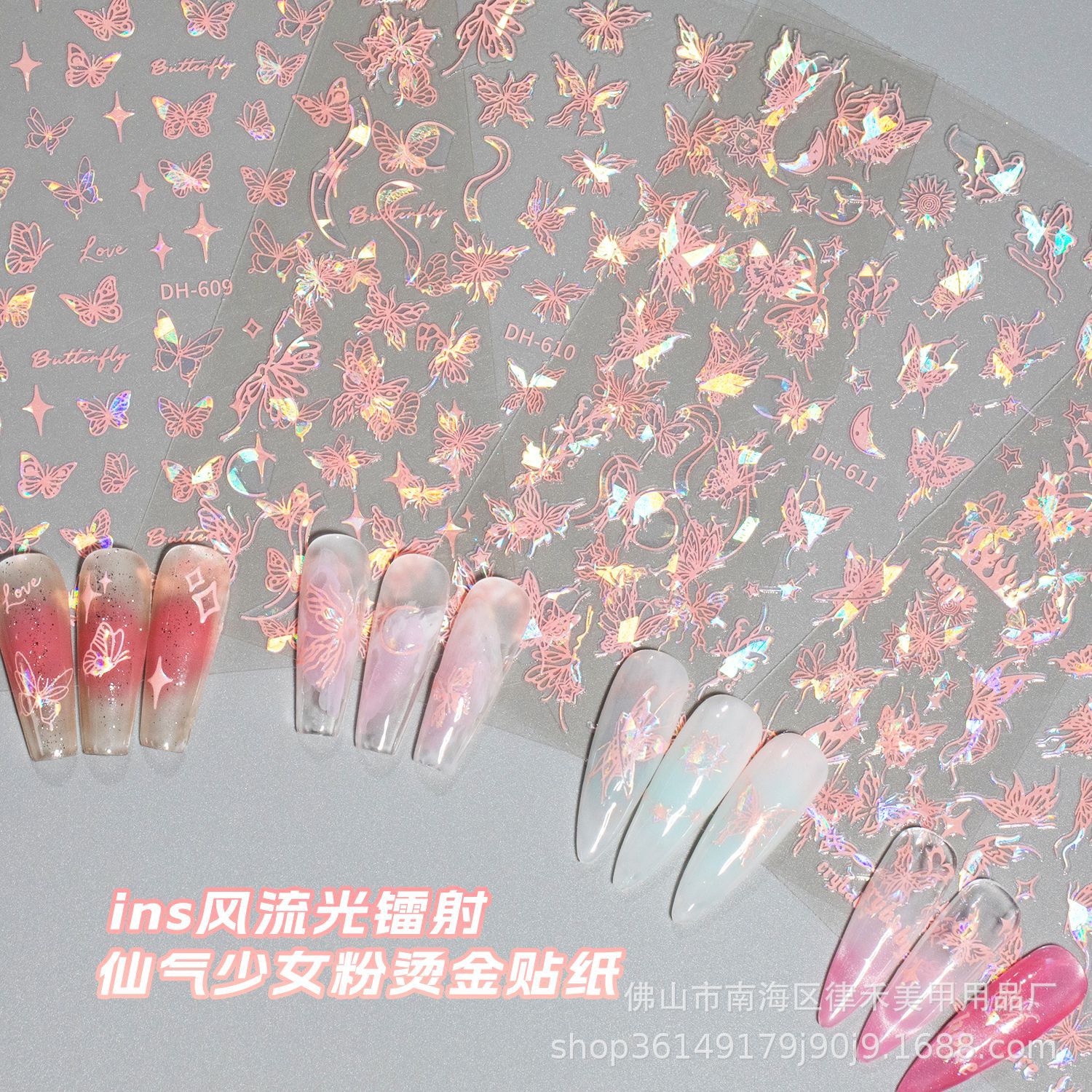 ネイルアートステッカー Pure Desire ins 流れるレーザー妖精ガールピンクホットスタンピングバタフライネイルステッカーライト高級ハイエンド