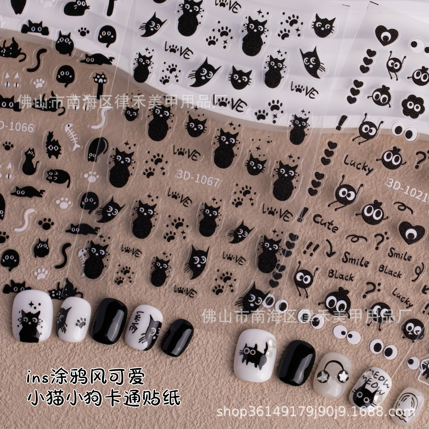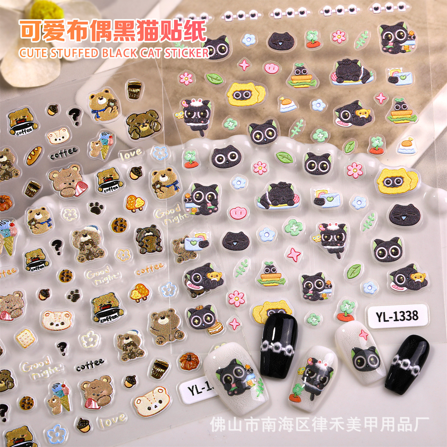 ネットセレブと同じスタイルのかわいい黒猫とクマのネイルアートステッカー、エンボス加工の超かわいい大きな目の黒猫と柔らかいかわいいクマのネイルデコレーション