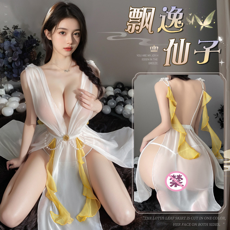 マンヤンセクシーランジェリー セクシーな透け感深いVネック ビーズ装飾 バックが美しい エレガントな妖精風ロングドレス コスプレ衣装1728