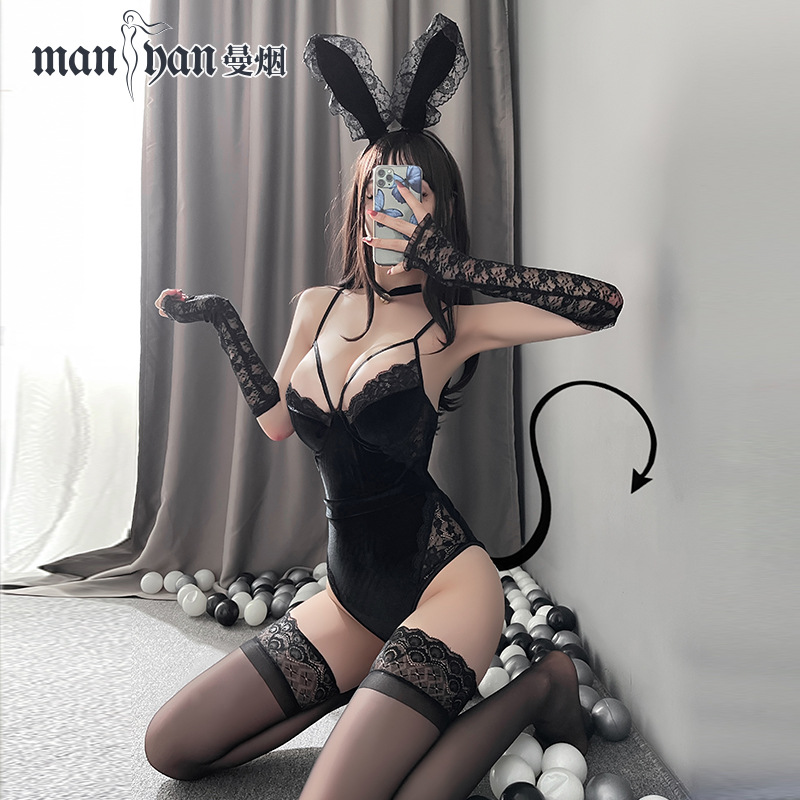 マンヤンセクシーランジェリー女性のセクシーなオープンクロッチレースバックリボンワンピースソフトかわいい猫メイド制服 100198
