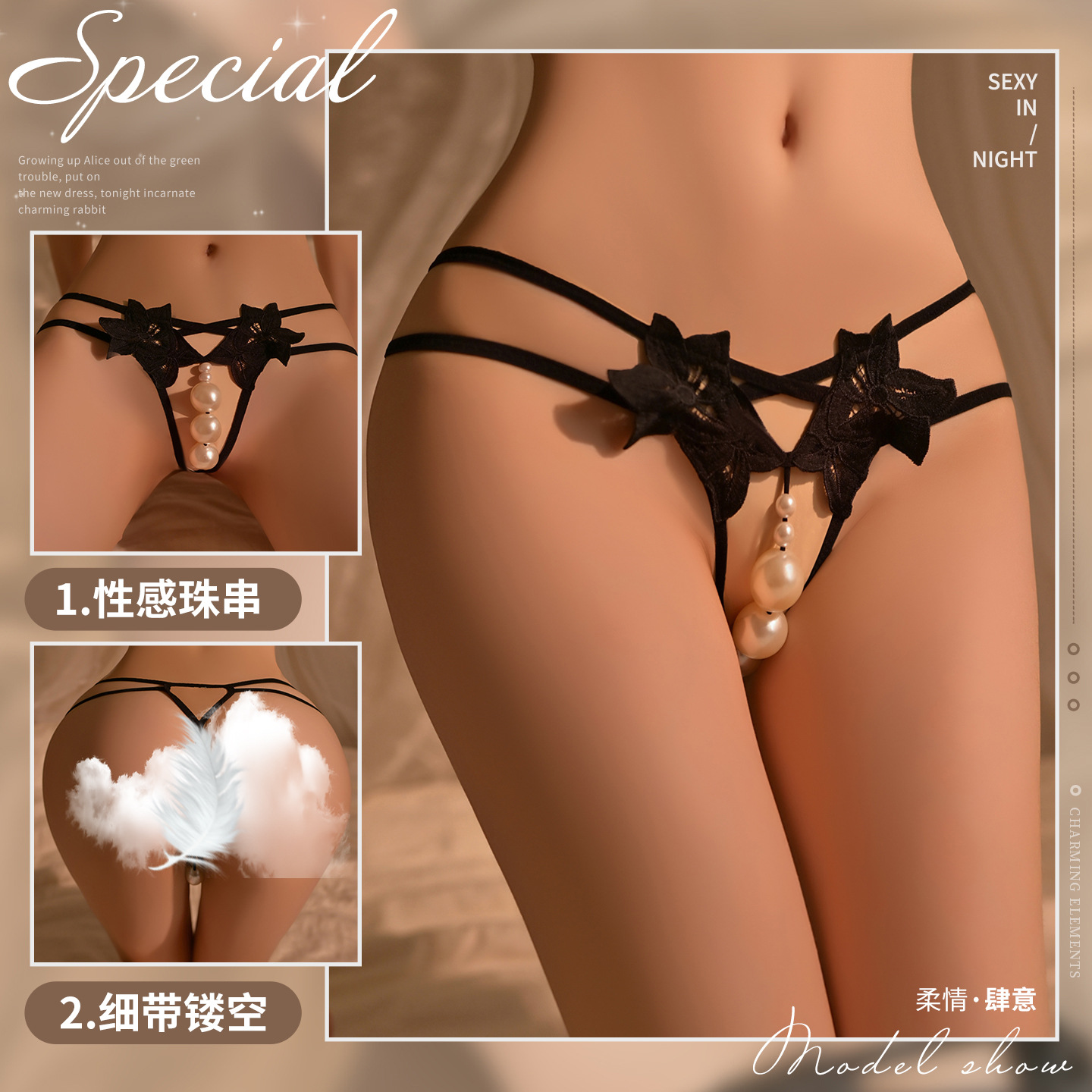 Manyan セクシーな下着女性のセクシーな大きな真珠水溶性ペンダント花びら中空セクシーな下着 Tバック 600013