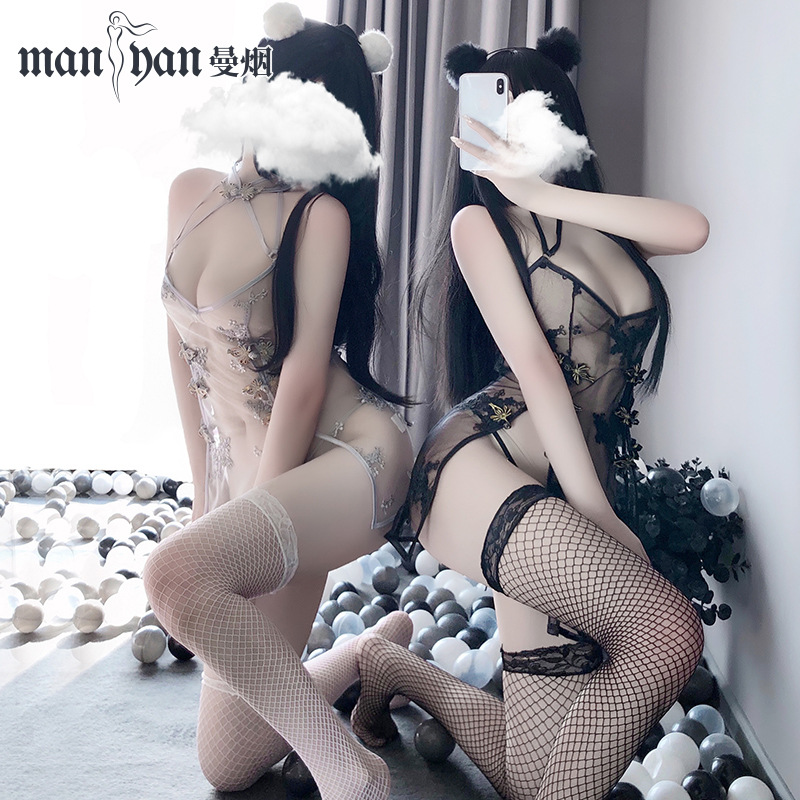 曼煙趣味下着セクシーレース透視ストラップ首付きロングスカート分体チャイナドレス寝スカートセット9917