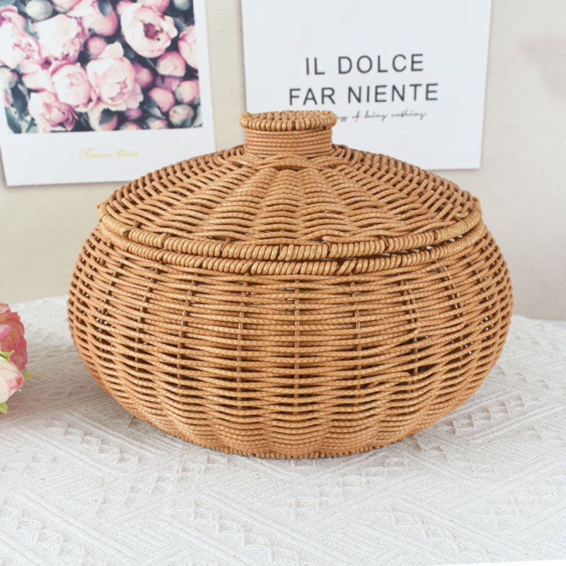 籐編みフルーツバスケット蓋付き円形スナック収納バスケット籐編み卵バスケット収納ボックスマントー餃子