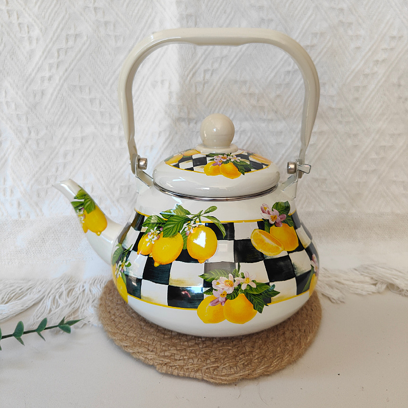 エナメル古鐘壺レモンの花やかんにまたがって、エナメルのティーポットをキャンプします。