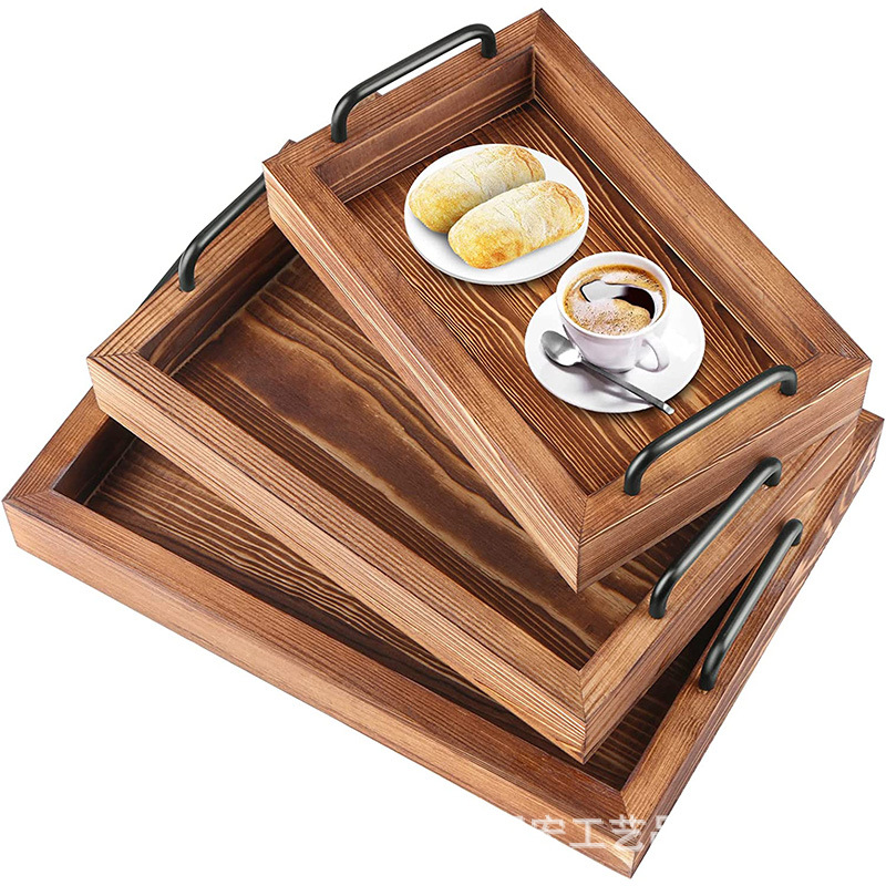 家庭用木製皿茶盤木製取っ手付き木製トレイ金属取っ手木製皿クロスボーダー