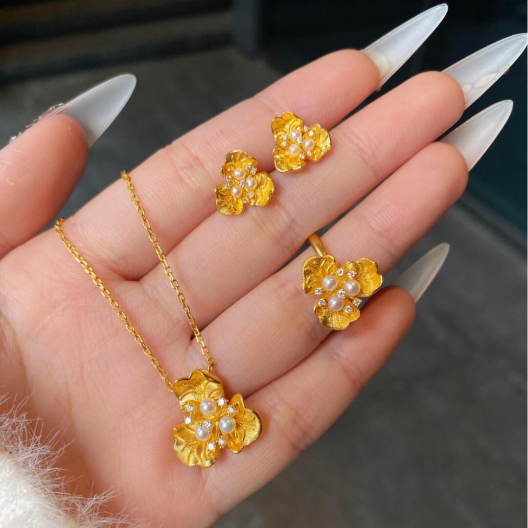 Ins風色モザイク真珠三葉花ネックレス指輪ピアス三点セット