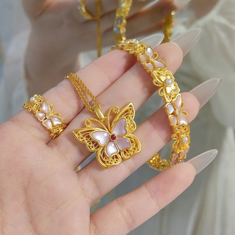 古法ピンク蝶ネックレスエナメル工芸中国風気質百合鎖鎖粉蝶アクセサリーセット