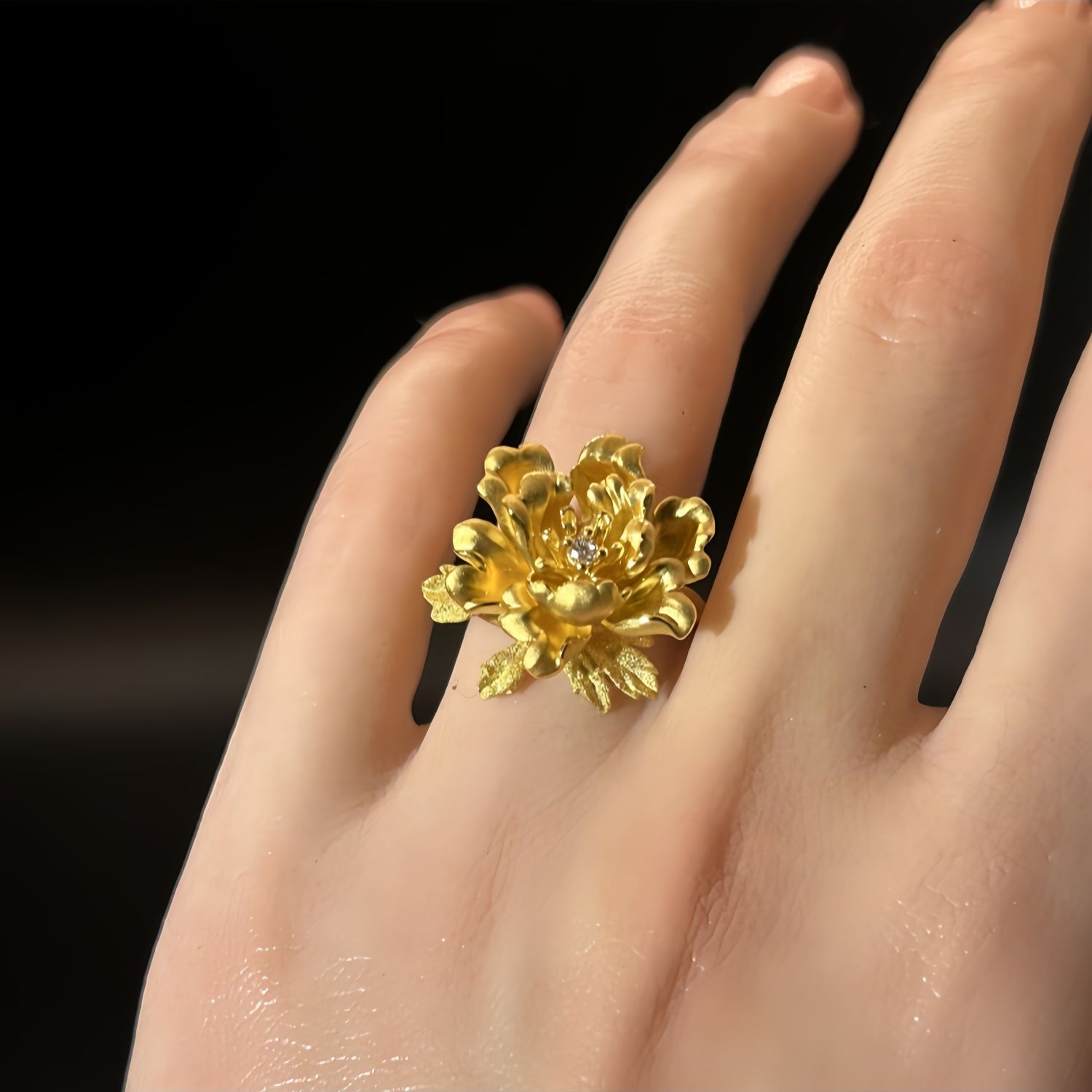黄金色の牡丹の花の指輪、富とクラシックなデザイン、気質を高め、美しく、レトロで多用途、軽い高級感、ニッチなデザイン