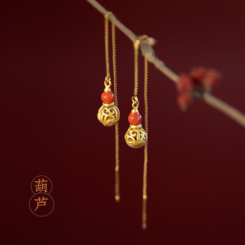 ひょうたん型の長耳飾り、古代の金細工が施された透かし彫りのイヤリング、レトロな南紅瑪瑙、中国風、シンプルで万能な女性用イヤリング、古代風