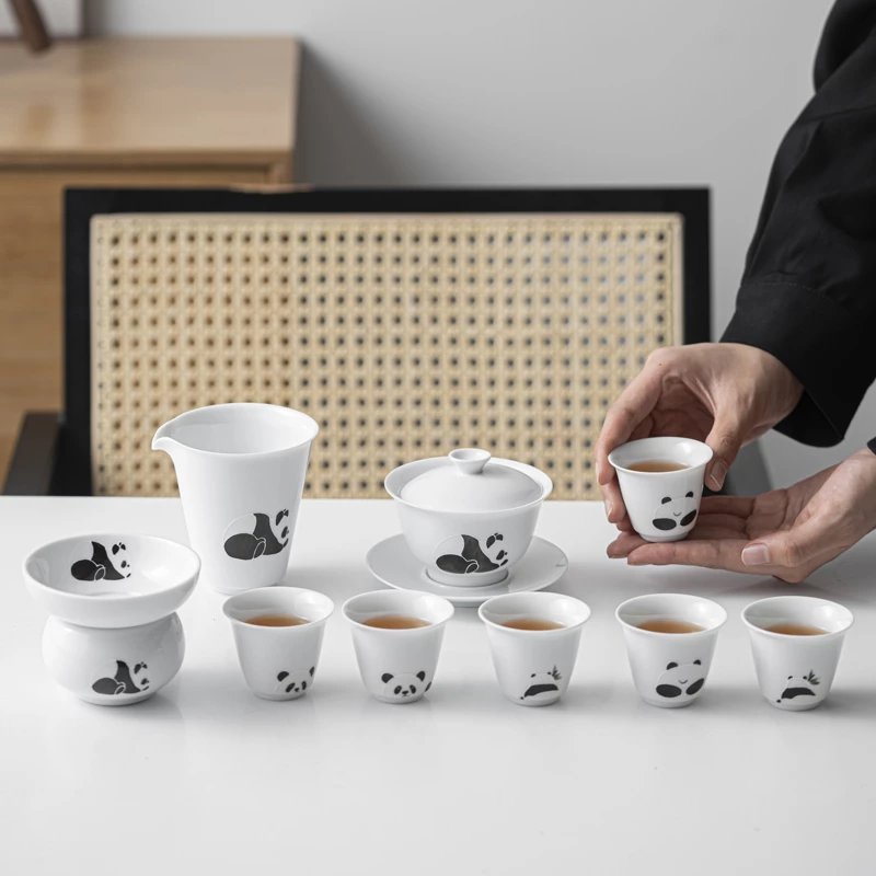 手描きのパンダの白い磁器の蓋の碗の家庭用の工夫の茶器の軽くて豪華でかわいい高級な茶器のセットのお土産のロゴ
