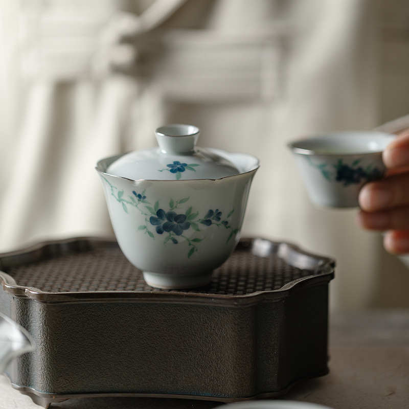 静道の手作りの花の口の蓋の碗の手描きの夕顔の花のセットの日本式の軽い豪華な古風な工夫の茶器のセットは贈り物をします。
