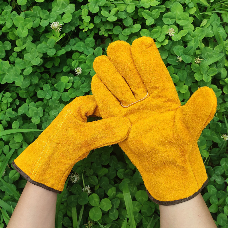 卸売り二層黄布全掌牛皮手袋反絨皮通気断熱溶接工手袋ショートタイプ電気溶接手袋
