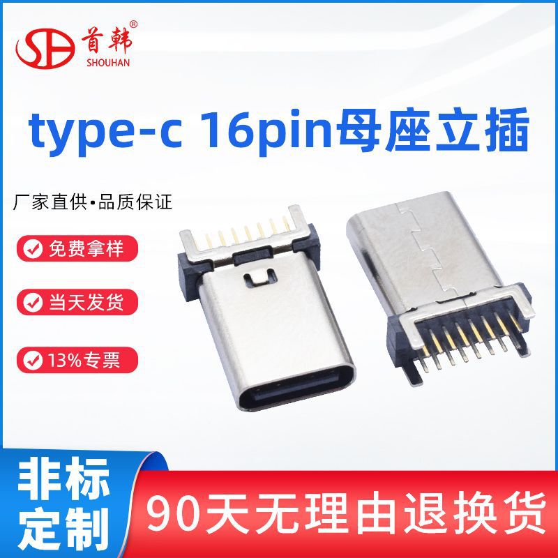 Type-c母座16pin縦型直挿無弾多規格大電流usbコネクタメーカー卸売り