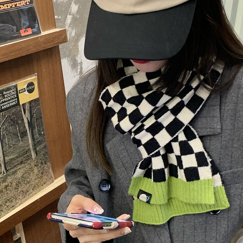 碁盤の格子のニットの毛糸のマフラーの女性の秋冬2021の新型の白黒の格子縞の韓国版の百合の学生は首を囲みます。
