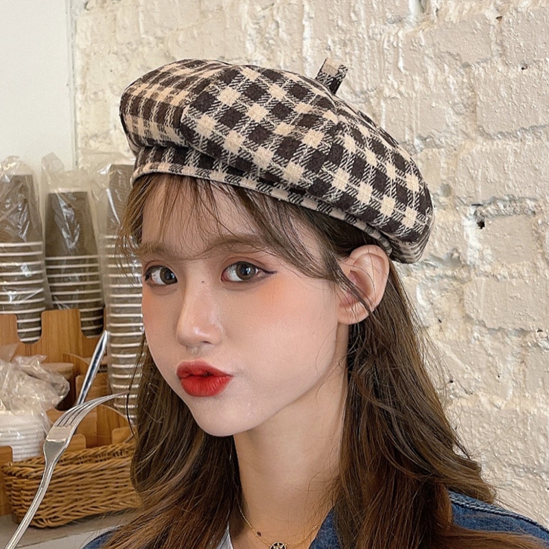 格子縞帽子ベレー帽女性英倫風レトロ秋冬ファッション潮insネット赤格子八角帽子