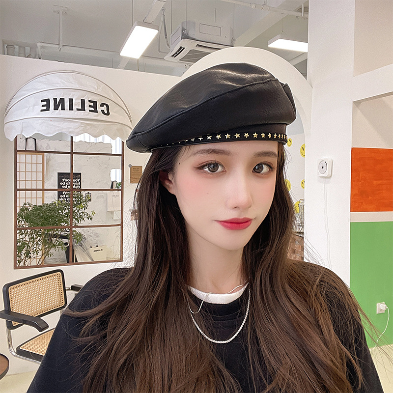 黒いpuの皮の帽子の女性の韓国版の潮の星のベレーの帽子の英倫の百合の八角の帽子の画家の帽子の文芸の復古