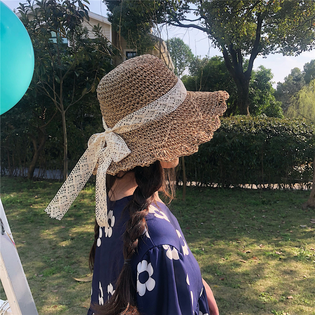 赫本風のレトロなレースは麦わら帽子の子供を連れています。夏は大きなひさしの帽子を畳むことができます。