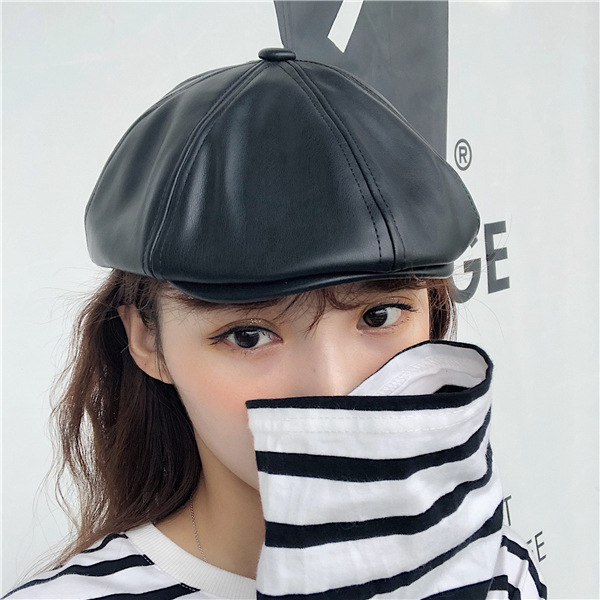 前進帽韓国版男女鴨舌帽pu皮春秋ベレー帽英倫復古秋冬新作ファッション帽子