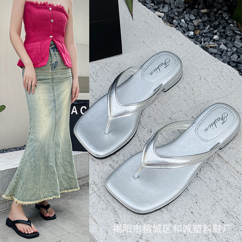 ファッションファッションの厚い底の銀色の人の字は女性の靴の2024夏の外で足の指のスリッパの海辺の涼しい靴を引き延ばします。