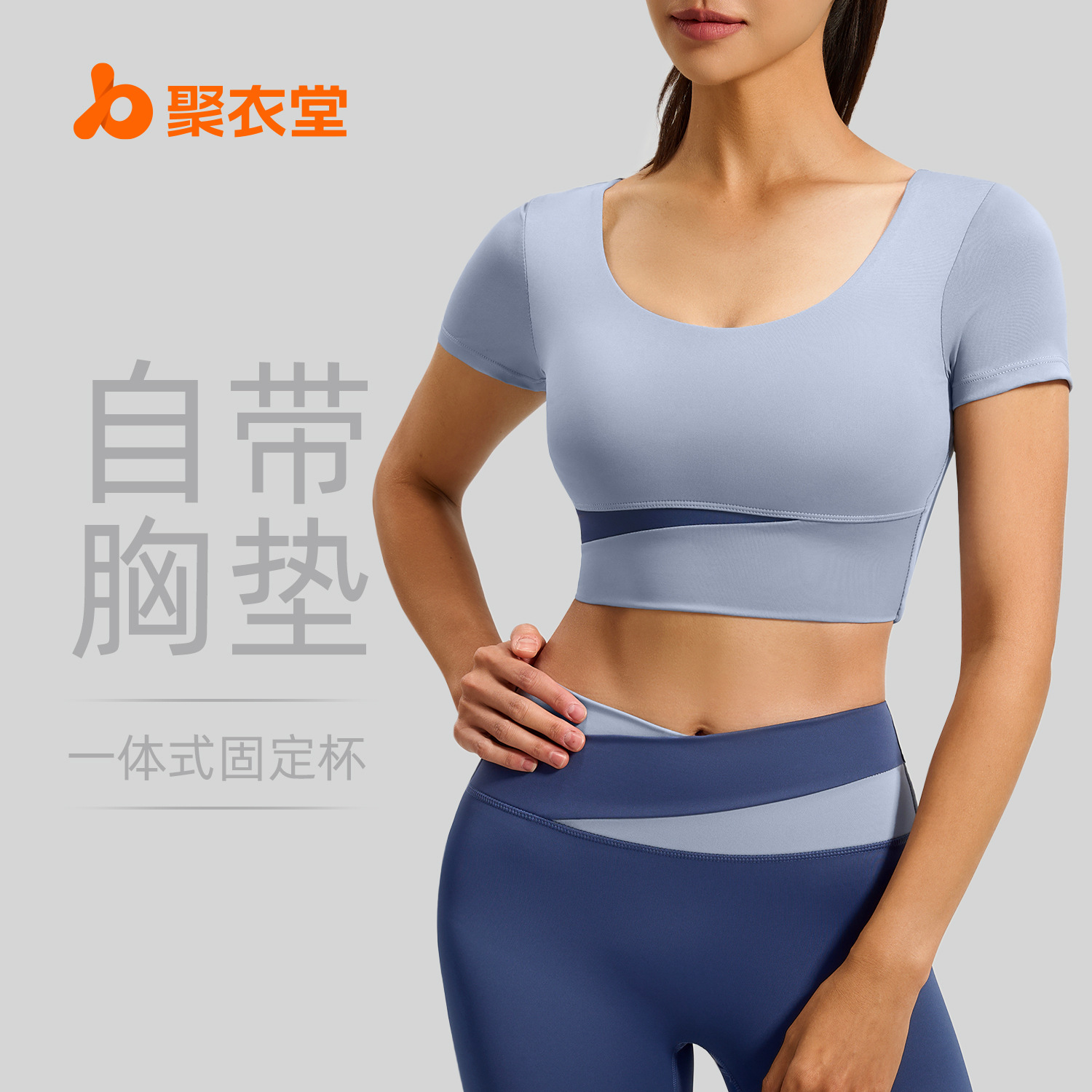 Juyitang 裸感露出へそヨガウェア レディース スポーツヨガ半袖フィットネスウェア トップス 胸パッドとカラーマッチング付き