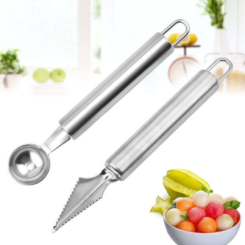 ステンレスの二頭の彫刻のボールを掘る器の果物の彫刻の刀は果物の切り器の台所の小さい道具の果物の分割器を切ります。