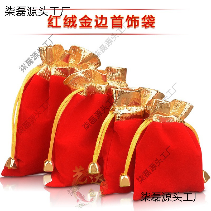 卸売りの赤いフランネルの布袋の金の縁の金口の首飾りの袋は縄を引いて袋の贈り物の装飾品の包装袋を縛ります。