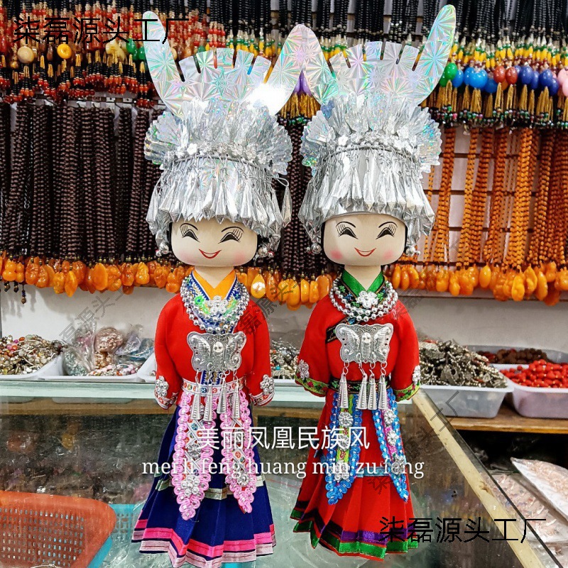 少数民族の苗族の子供の手作りの木製の人形は雲南広西の貴重な色の人形の旅行の記念品を並べます。