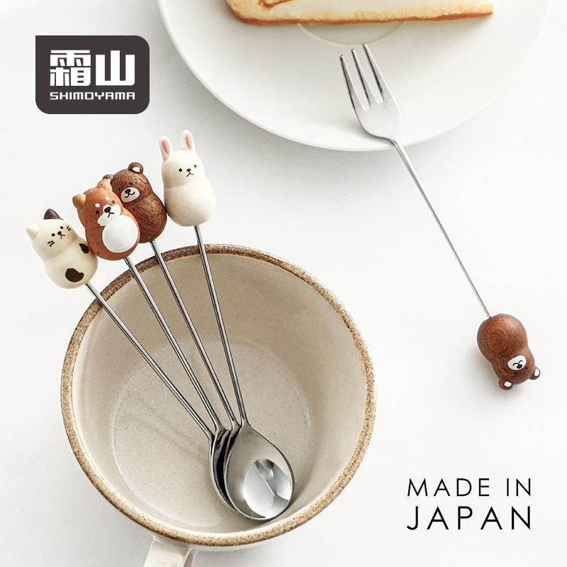 霜山日本輸入動物シリーズ実木動物頭フォークスプーン猫兎熊柴犬ステンレス食器