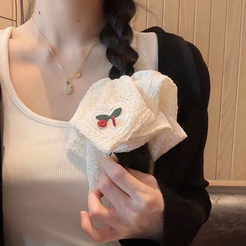 大きなレースのラブチェリーホワイト中空スクエアスカーフ、スイートガーリーハートポニーテールゴムバンドヘッドバンド