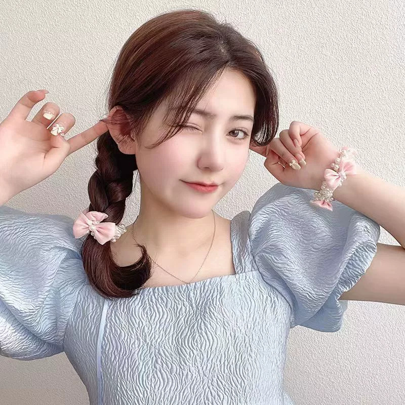 芸能人同風リボンパールヘアバンド、スイートポニーテール、高弾性ゴムバンド、シンプルで万能なブレスレット、兼用ヘッドギア