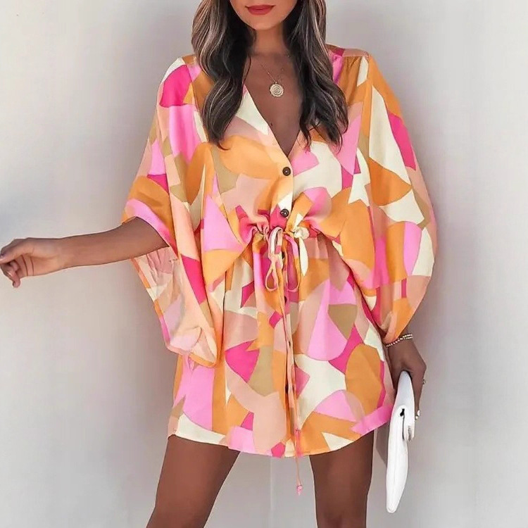 2021独立系ウィッシュアマゾン人気夏長袖Vボタン半袖プリントドレスロングスカート