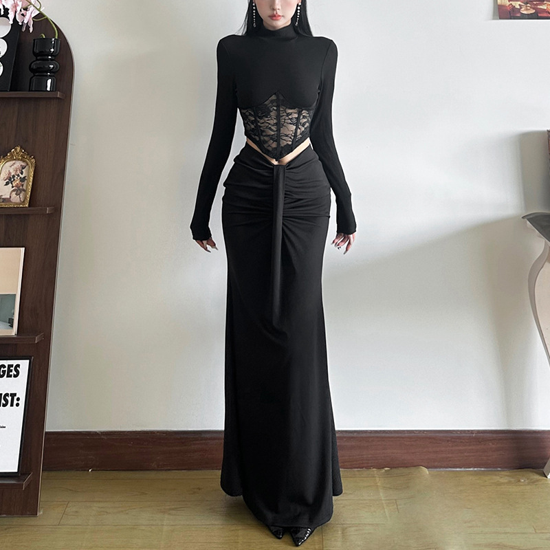 クロスボーダーヨーロッパとアメリカンスタイルの2025秋の新しい女性のハイカラーレース中空トップスリムフィットヒップハグハーフレングススカート