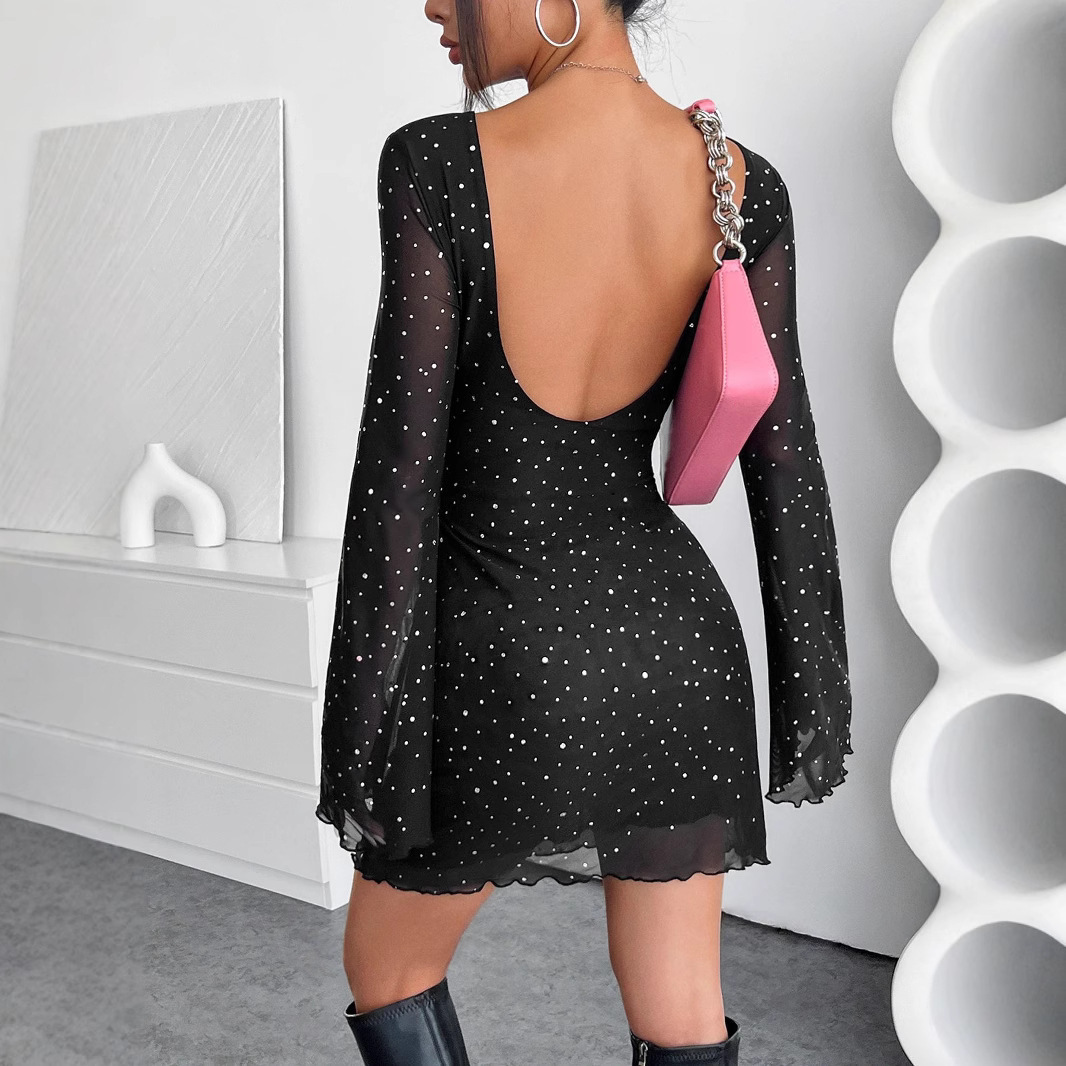 ヨーロッパとアメリカのクロスボーダー Amazon 2025 新しいエレガントな女性のブラックメッシュスパンコールバックレススリム長袖ジャンプスーツ