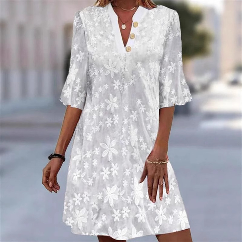 Amazon AliExpress 2025 新しい夏の婦人服ヨーロッパとアメリカのクロスボーダー刺繍ミッドスリーブ V ネックボタンドレス女性用