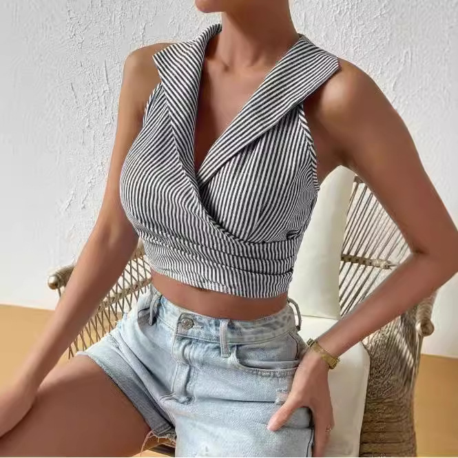 ヨーロッパとアメリカのクロスボーダーAmazon 2025新しいセクシーなスリムデザインホットガールストライプラペルベストショートトップ