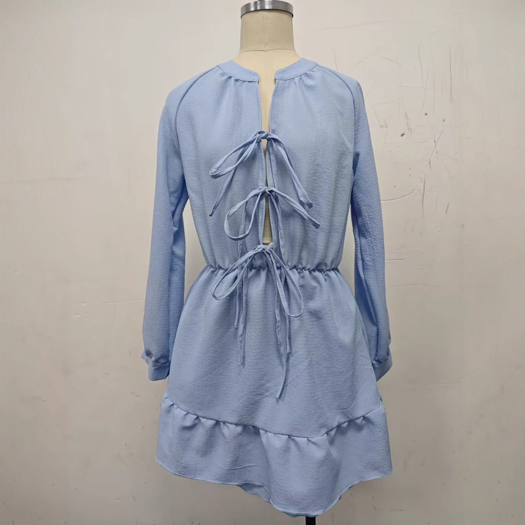 ヨーロッパとアメリカのクロスボーダー Amazon 2025 婦人服無地レースアップカーディガンラウンドネックランタンスリーブトップハイウエストドレス