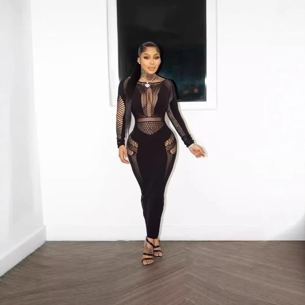 ヨーロッパとアメリカの 2025 新しい夏の女性の無地ラウンドネックセクシーなスリム中空ニットロングヒップカバードレス女性のための