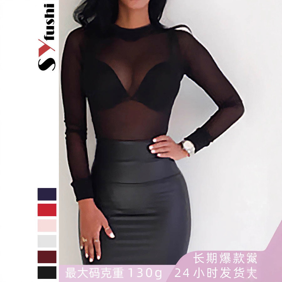 2025 越境貿易夏の女性のセクシーな超薄型メッシュ弾性タイトな長袖ハーフタートルネックボトリングシャツ