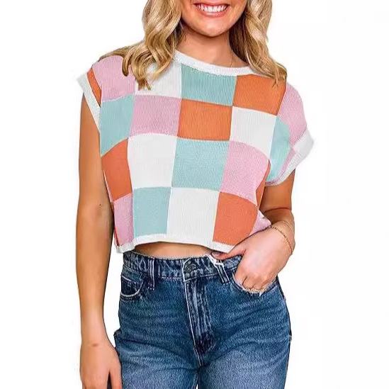 新しいクロスボーダー Amazon 2025 キャップスリーブへそ露出半袖カラーブロックラウンドネックニット長袖チェッカーボードセーター