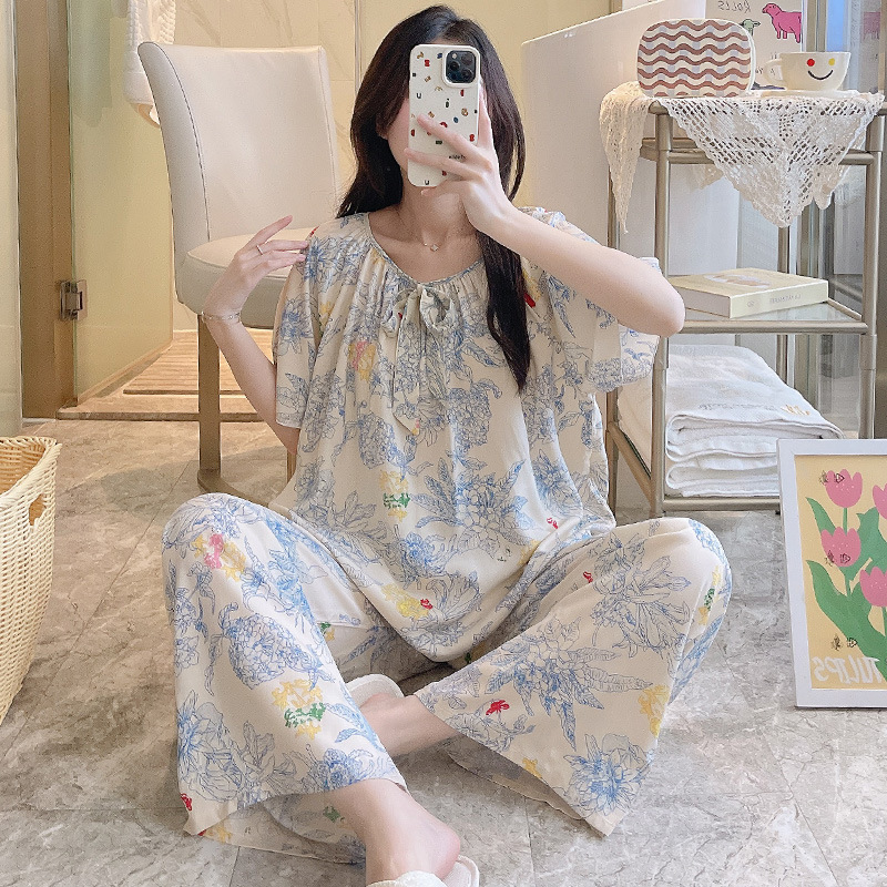女性用パジャマ、春夏の新しい綿シルクのホーム服、屋外で着用可能、国民風の女性の半袖エアコン付きルーム綿シルクスーツ、薄手
