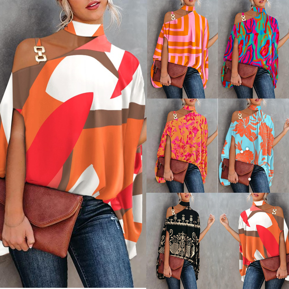 2022 独立したステーションウィッシュアマゾン人気の夏のホルターネックバットスリーブプリントシャツレディースシャツ婦人服