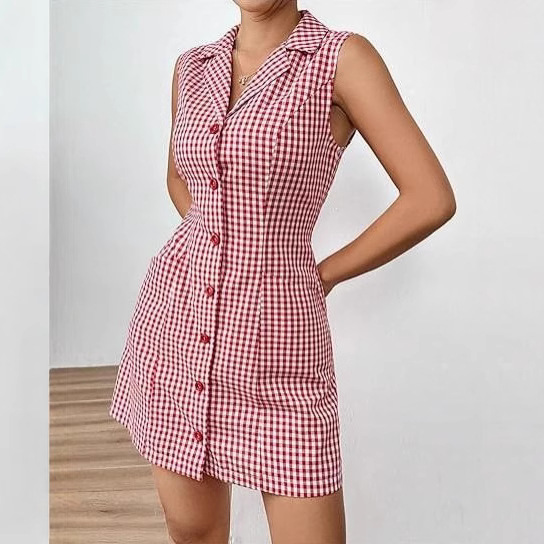 ヨーロッパとアメリカのクロスボーダー 2025 Amazon 夏の新しいフレンチレトロチェック柄ノースリーブレディースラペルドレス