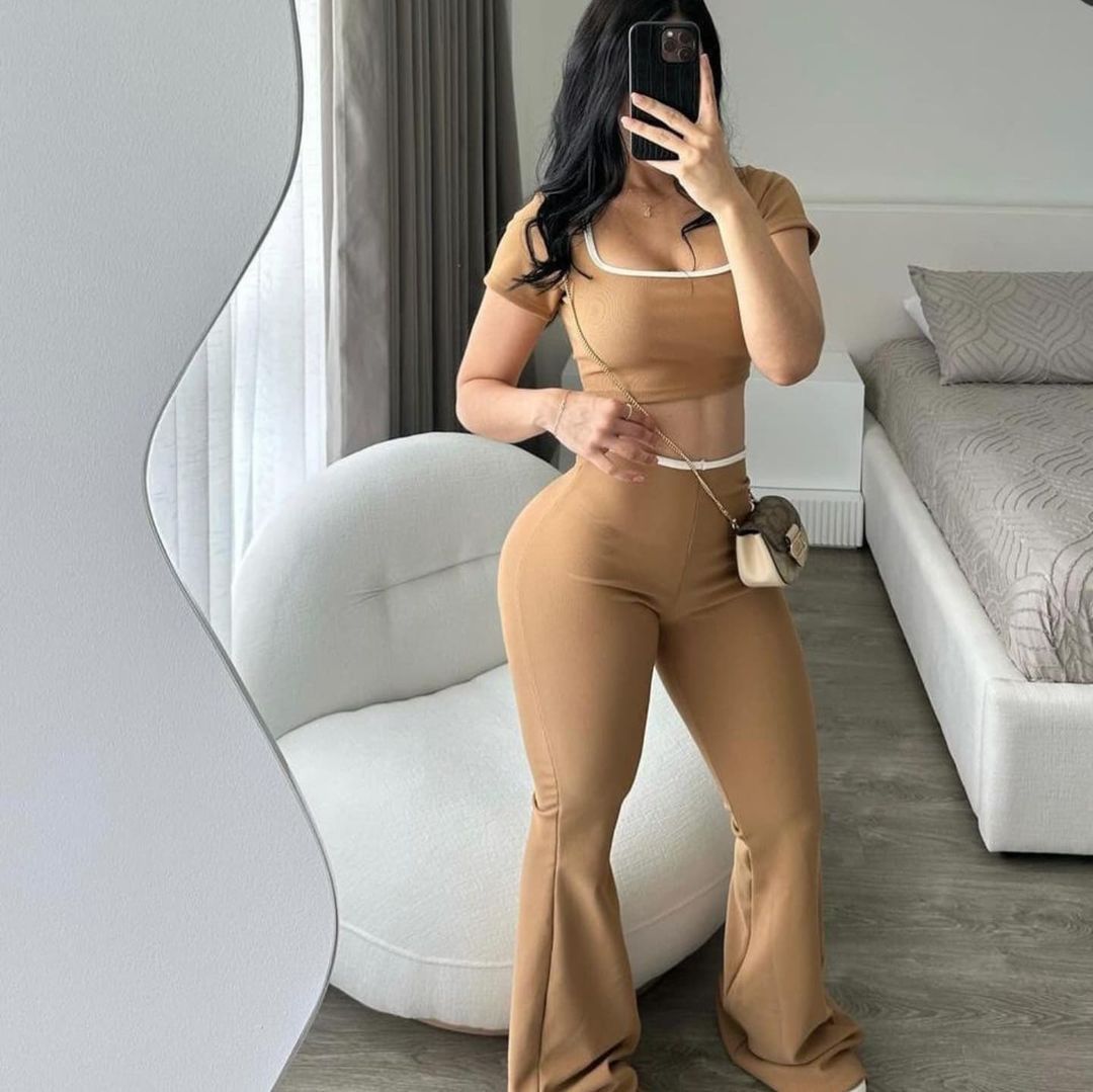 ヨーロッパとアメリカの新しいクロスボーダーファッション無地カジュアルスポーツスタイルスリムショートトップ半袖フレアパンツスーツ女性用