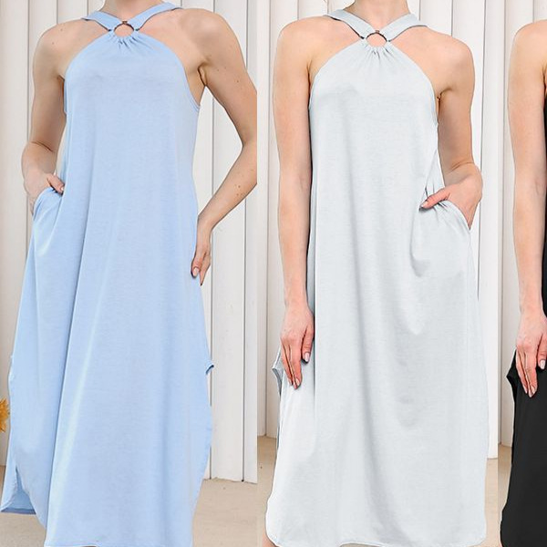 2025 クロスボーダーヨーロッパとアメリカの夏のファッション女性の無地オフショルダーホルターネックポケット付きカジュアル薄手のロングドレス