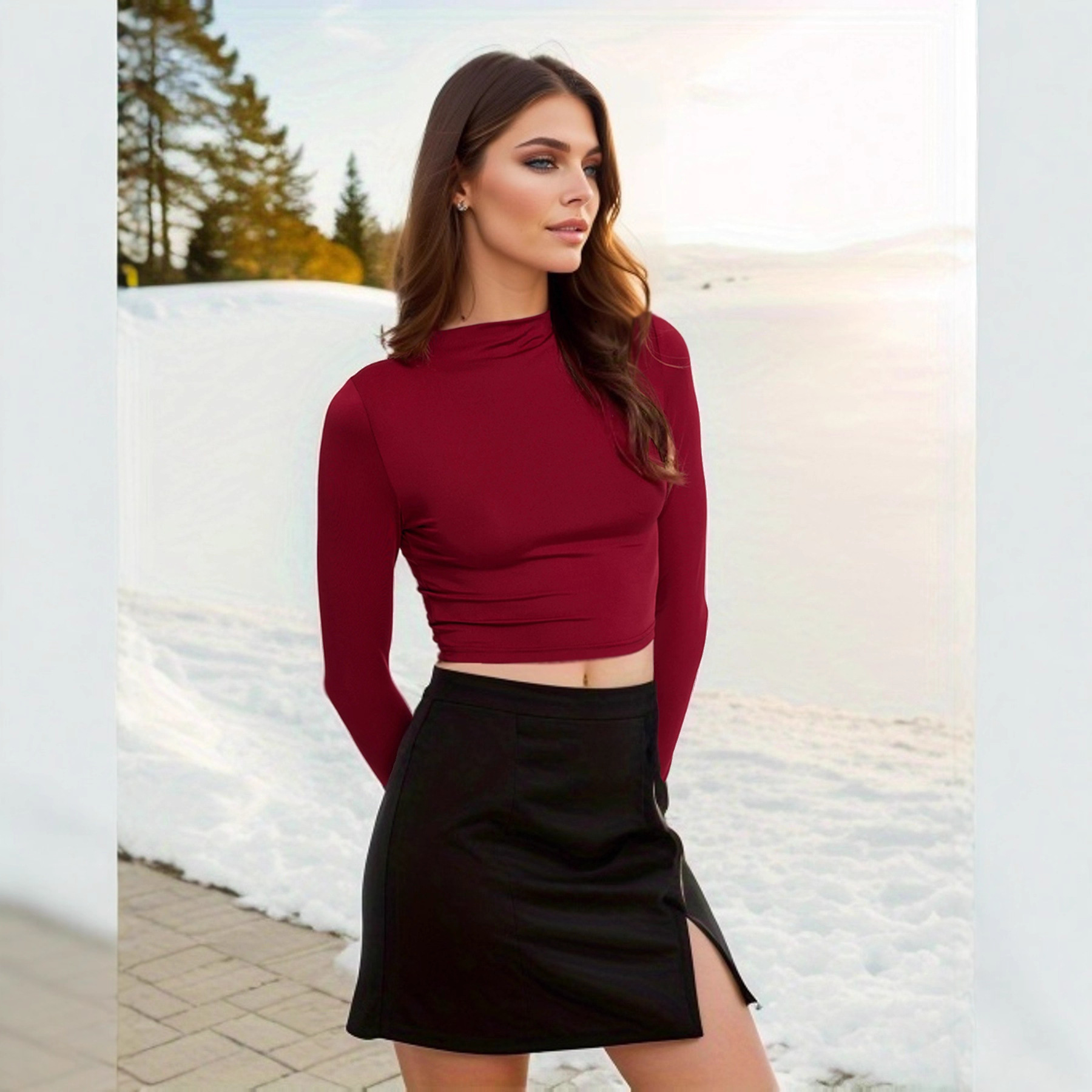 2025冬ヨーロッパとアメリカのクロスボーダー新しい女性のセクシーでファッショナブルなスリムフィットへそ露出ハーフタートルネックショート長袖トップ