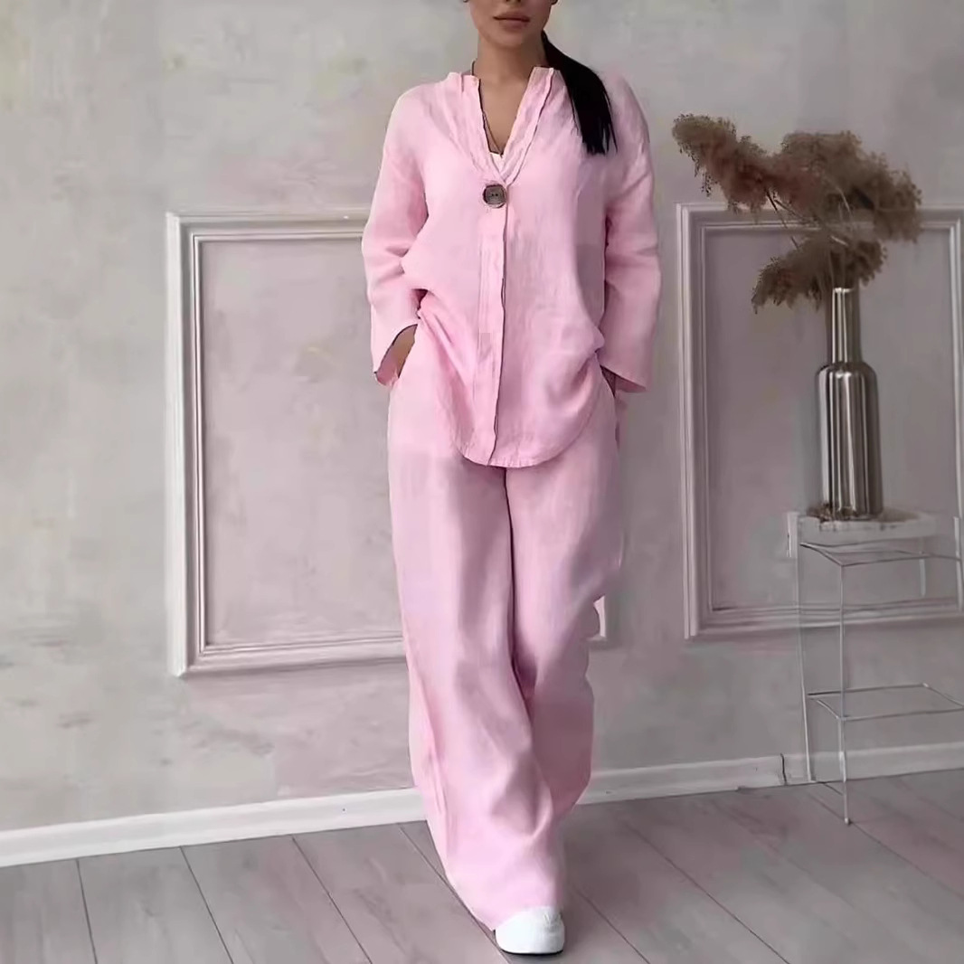 2025年夏のクロスボーダー貿易女性服、ヨーロッパとアメリカの売れ筋のゆったりとしたファッショナブルなトップス、ワイドレッグパンツ、カジュアルな綿とリネンのスーツ