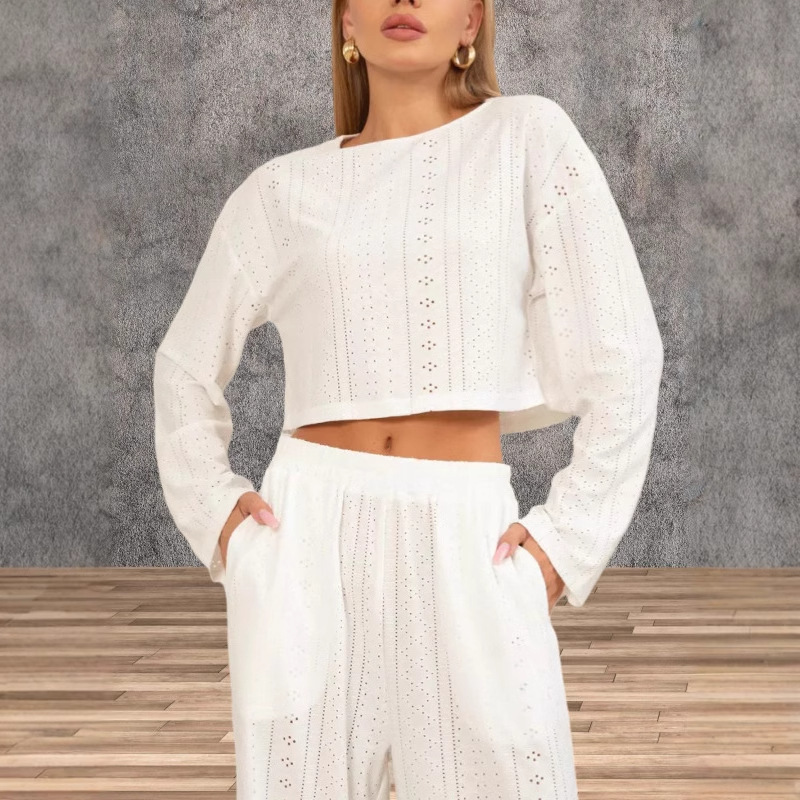クロスボーダーロシアファッションカジュアルスーツ新しいヨーロッパとアメリカの女性のパジャマ中空ジャカード長袖ズボンは屋外で着用できます