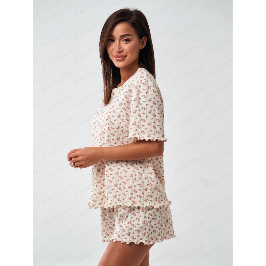 ヨーロッパとアメリカの春の新ファッションスーツクロスボーダー花柄ピットストリップラウンドネックフリルスリーブ半袖ショーツレディースホームウェア